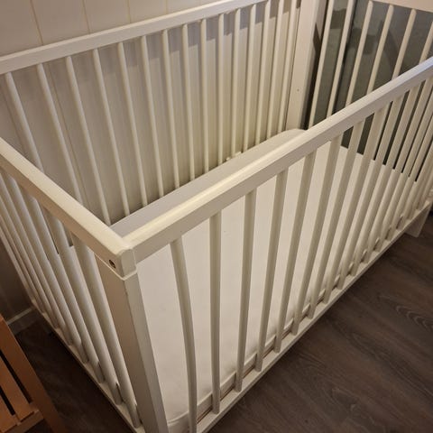 Troll sprinkelseng i klassisk design med rette sprosser på alle sider. Den har justerbar bunn som kan tilpasses barnets alder og behov. Kan og justere ene langsiden for å gjøre den til bedsidecrib. Egnet som seng til baby og småbarn på barnerommet. Den er pent brukt og i god stand, noen bruksmerker (se bilde). Madrass kan medfølge om ønskelig.