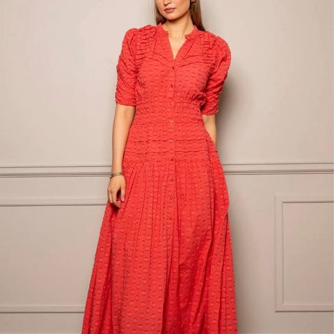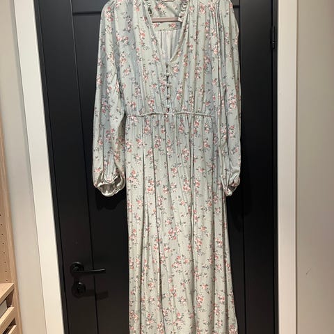 MISSMAYA Vanessa sommerkjole i størrelse XS for dame. Kjolen er laget i bomull og har et blått mønster. Modellen har lange ermer, v-hals og volangdetaljer i skjørtet og splitt. Passer godt til bruk på varme dager eller til hverdags og enkle anledninger. Ny med lappen på. Siste bildet viser samme kjole, men med annen farge. Kostet 1800kr ny.
