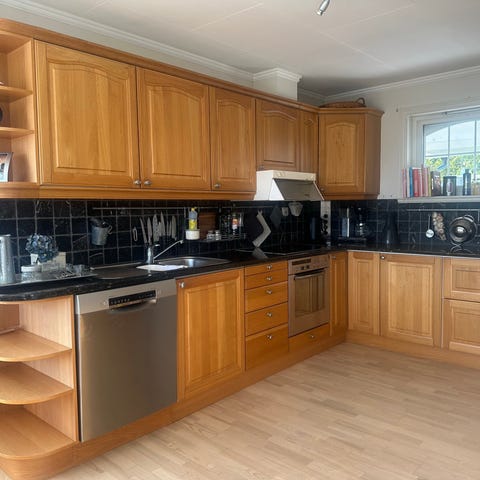 Stekeovn, koketopp og oppvaskemaskin kan følge med.