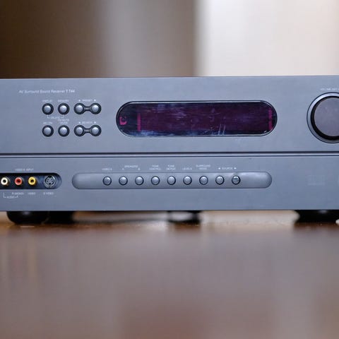 Fjernkontroll følger med. På-knappen har blitt litt slitt, men resten fungerer som de skal.