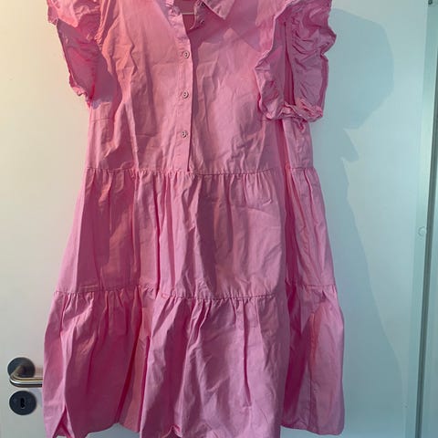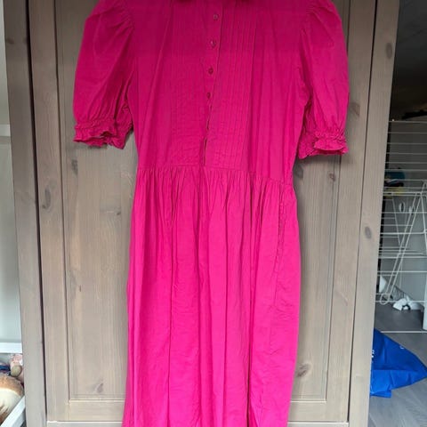 Line of Oslo sommerkjole for dame i størrelse S men passer og str m.Kjolen er rosa og laget av 100 % lin. Modellen har korte puffede ermer, knappestolpe foran og krage med volangdetaljer. Passer som lett sommerkjole i hverdagen eller til enkle anledninger.