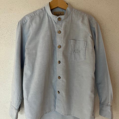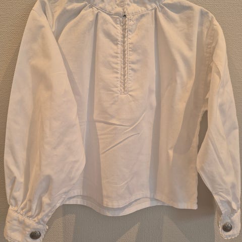 Lite brukt bunadsskjorte fra Reflex, ingen bruksmerker. Trykknapp og hempe i halsen, pene knapper på ermene. Kan brukes av både gutt og jente. Str 110, ca 5 år.