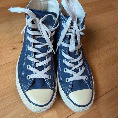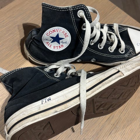 Converse Chuck Taylor All Star sneakers i størrelse 37. Brukt en gang eller to i lystig lag (derav noen flekker, se bilde, de som har peiling får de sikkert bort), blitt lagt på loftet for 15+ år siden og funnet nå. For kule til å kastes, selges derfor på finn 👍