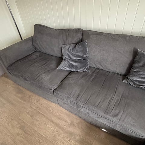 Sofaen er komfortabel og solid, men trekket trenger en rens, derfor selges den rimelig. Kan bli veldig fin igjen etter rengjøring.
