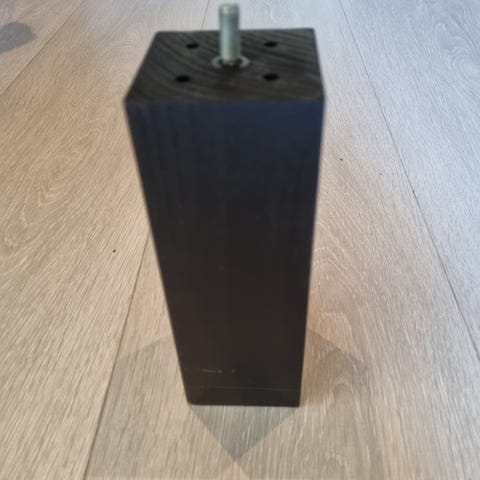 Skeidar sengeben i svart farge. Benet har skrå, rektangulær form med festehull på toppen og medfølgende skrue for montering. Egnet som ben til seng eller sengebunn fra Skeidar med kompatibelt festesystem. Passer for deg som trenger ekstra eller utskiftbare sengeben i nøytral, mørk utførelse.