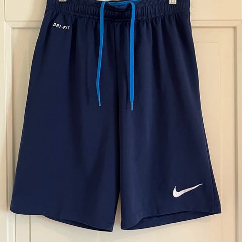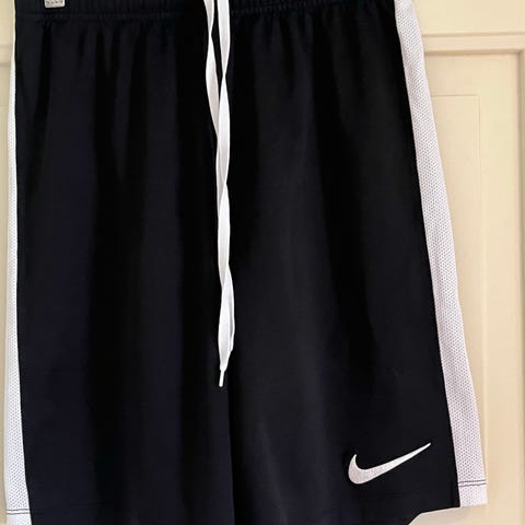 Nike Dri-FIT fotballshorts unisex i størrelse M. Shortsen er svart med hvite striper langs sidene og hvit snøring i livet. Elastisk linning for justerbar passform. Laget i lett, teknisk materiale med Nike Dri-FIT-teknologi som transporterer fukt bort fra huden. Egnet til fotball og annen fysisk aktivitet, samt til hverdagsbruk.