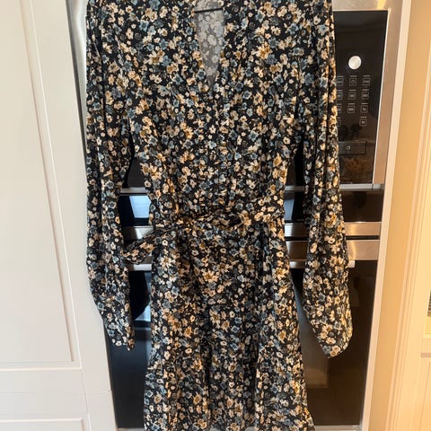 Vila hverdagskjole for dame i størrelse 40. Kjolen er flerfarget med mønster og laget i polyester. Modellen har lange ermer og knelengde, med lett innsvinget midje og volangkant nederst. Passer som hverdagskjole eller til enkle anledninger.
