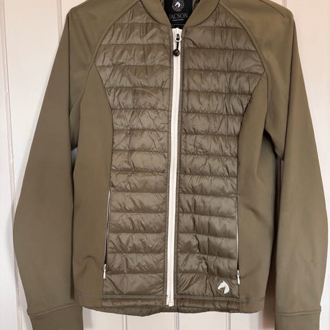 Grønn tynn jakke til dame. Har vært brukt av en størrelse 38 og passet fint. Strikk i ermer og disse går ikke helt ned til håndleddet.