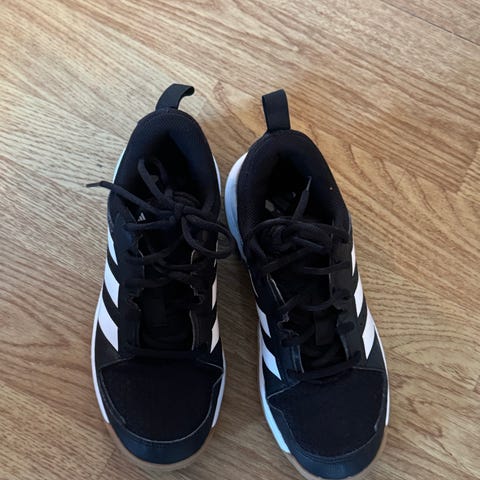 Selger lette Adidas innesko / fotballsko til barn i svart med hvite detaljer. Skoene har lisser og en fleksibel gummisåle som gir godt grep på innendørs underlag, perfekt til gymsal, håndball eller innefotball.