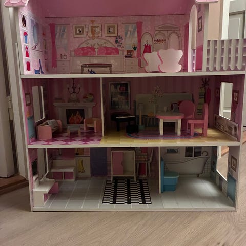 Barbie dukkehus med flere etasjer og garasje. Huset har flere rom fordelt på tre etasjer, inkludert stue, kjøkken, soverom og bad. Det følger med diverse møbler og innredning som seng, stoler, bord og sofa. Dukkehuset er laget i hovedsak av tre og plast, med trykte veggdekorasjoner i lyse og rosa fargetoner. Egnet for lek med Barbie-dukker og lignende motedukker i tilsvarende størrelse. Noe bruksmerker.