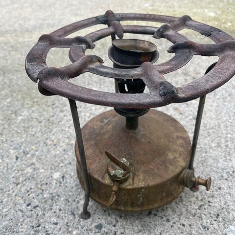 Primus r turkjøkken i metall. Klassisk, trykkbasert brenner med rund tank nederst og tre støttebøyler rundt brennerhodet. Egnet som enkelt kokeapparat for friluftsliv eller som reservedel/deler til eldre primus- og parafinbrennere. Tilstand og funksjon bør kontrolleres og eventuelt overhales før bruk.