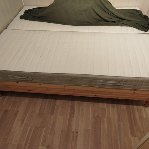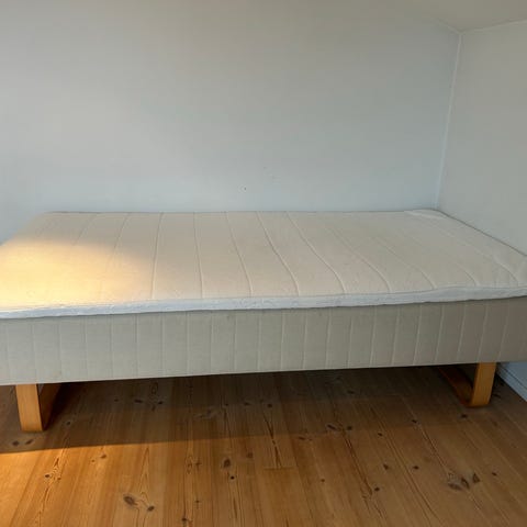 Selger 140x200 seng bestående av ramme fra Ikea, hovedmadrass fra Dreamzone og overmadrass fra Ikea.