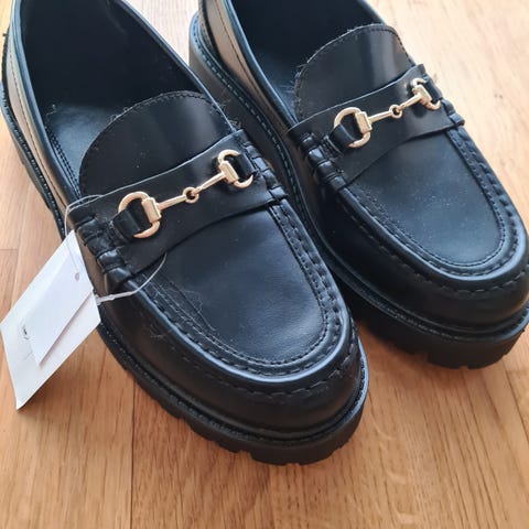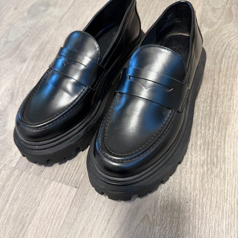 H&M loafers sko i svart farge i størrelse 37. Skoene har glatt, blank overdel og kraftig såle med mønster for bedre grep.