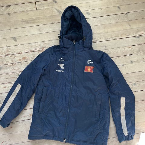 Det er små initialer, men disse kan nok fjernes. De er kjøpt for 1000kr per jakke. De er nesten ikke brukt og er super fine og varme! De selges for 300 per jakke og 500kr for begge. Jakken er mørk blå med hette og hel glidelås foran. Polstret innside gir ekstra varme, egnet til fotball og annen utendørs aktivitet. Klubblogo og «Heming Fotball» trykk på rygg. Passer til barn rundt 158 cm som trenger en varm trenings- eller klubbjakke til fotball.