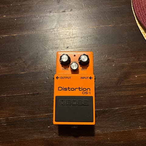 Boss DS-1 distortionpedal i oransje farge. Pedalen har kontroller for tone, level og distortion, samt inn- og utgang for gitar og forsterker. Strømtilkobling via 9V-adapter eller batteri (avhenger av modellens standard). Egnet for elektrisk gitar og kan brukes i ulike musikksjangre der man ønsker forvrengt gitarlyd.