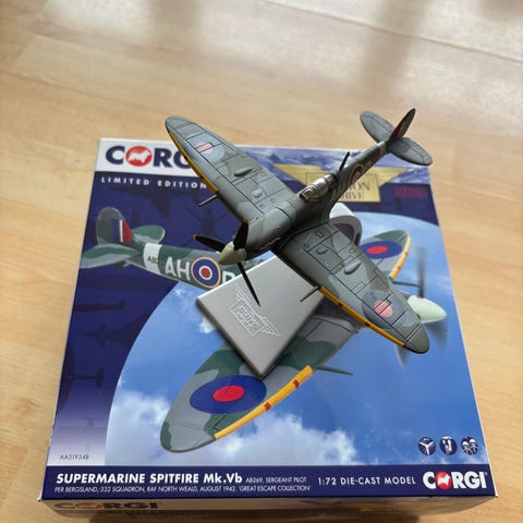 Corgi The Aviation Archive modellfly av typen Fokker Dr.I i rød og hvit farge. Limited Edition-utgave i die-cast metall. Modellen viser et historisk dobbeltdekker-jagerfly, levert i original eske med illustrasjon av flyet i lufta. Egnet som samleobjekt eller utstillingsmodell for luftfartsinteresserte.