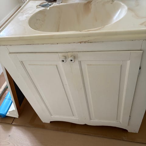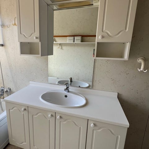 Baderomsinnredning servantskap speilskap og overskap kastanjebrun