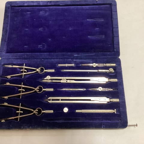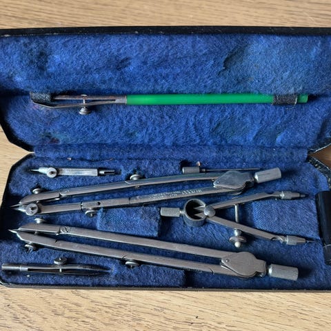 Mano tegnesett i etui. Sett med flere tekniske tegneredskaper i metall, blant annet passer, forlengere, blyinnsatser og andre deler for presisjonstegning. Inneholder også gradskive. Leveres i et avlangt etui med innvendig stofftrekk og tilpassede plasser til hvert verktøy. Egnet til teknisk tegning, geometri og annet presisjonsarbeid på papir.