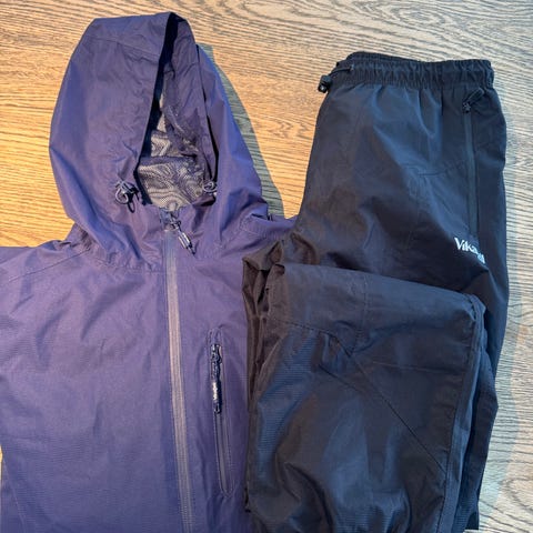 Norheim jakke og bukse (opprinnelig regnsett, men passer nok nå best som ekstrasett), «bomber» jakke fra KappAhl. Sett str 8, jakke str 140, men ble brukt samtidig. Selges samlet for 150 kr.