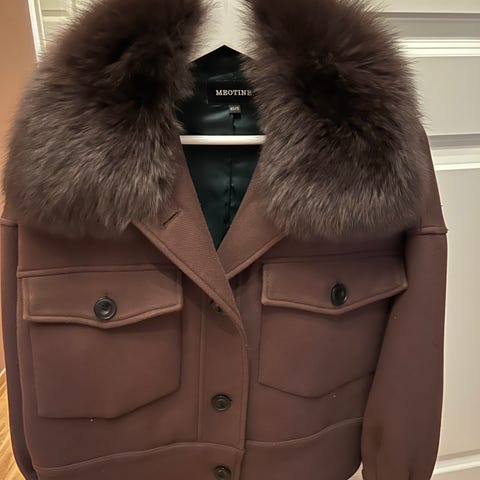 Selger en veldig fin jakke fra Meotine i størrelse XS/S. Jakken er mørk brun og har en stor, myk krage i ekte pels. Klassisk og fin modell som passer til de fleste, mtp den er oversized!