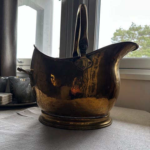 Messing peissett med dekorativt stativ og tilhørende redskaper. Settet består av flere lange redskaper i messing, blant annet feiebrett og andre typiske peisredskaper, som henger på et frittstående stativ. Stativet har rektangulær fot med rillet mønster og kuler som bærer tverrstangen. Redskapene har utsmykkede håndtak med klassiske detaljer. Egnet til bruk ved peis eller vedovn til håndtering og rydding av aske og ved.
