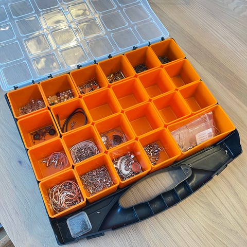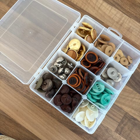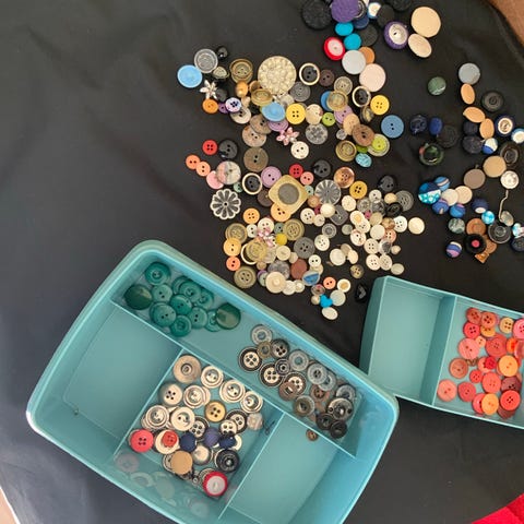 Selger et stort skrin med masse knapper. De største er 2,5 cm og de minste 1 cm. Mange med made with love motiv og andre helt plaine.