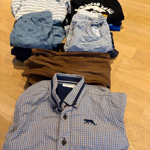 4 gensere og 5 tskjorter i størrelse 110/116. Den ene genseren er i str 104, men den er stor i størrelsen og blitt brukt samtidig som de andre:)