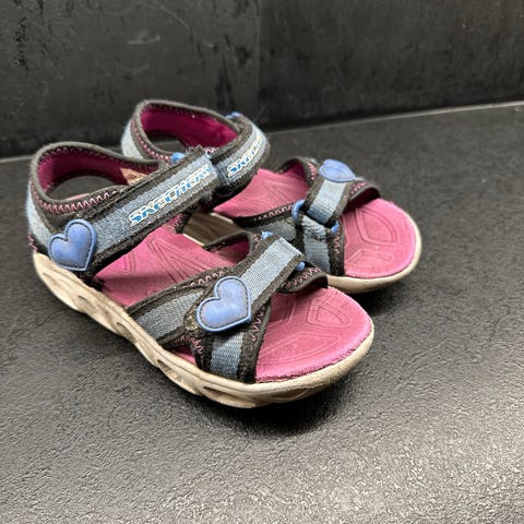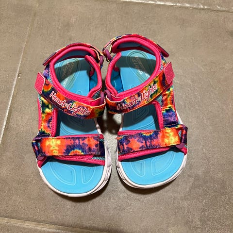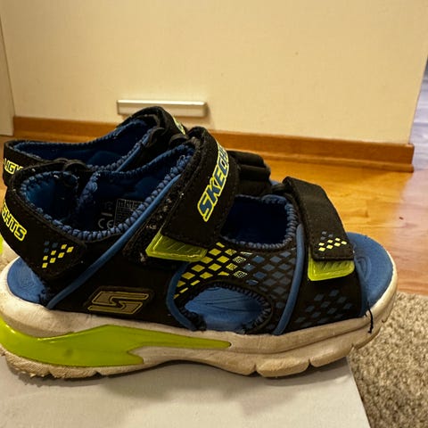 Skechers sandaler for barn i størrelse 27. Sandalene har grønn såle og remmer med kamuflasjemønster. Justerbare borrelåsremmer over fot og rundt ankel for god tilpasning. Egnet som sommersko eller til bruk både inne og ute. Blinke sandaler