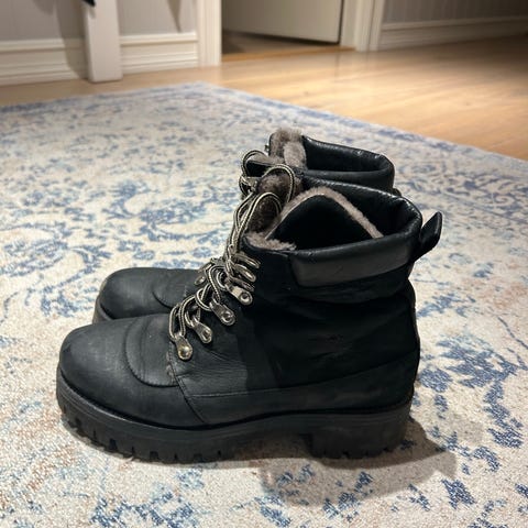 Woden støvler i størrelse 39. Modellen er svarte snørestøvler med kraftig yttersåle og metallhekter til skolissene. Overdelen fremstår som semsket eller nubuck-lignende materiale med myk tekstilkant øverst på skaftet. Sålen har grovt mønster for bedre grep. Passer til bruk i kjøligere vær og hverdagsbruk der det er behov for stabile og robuste sko.