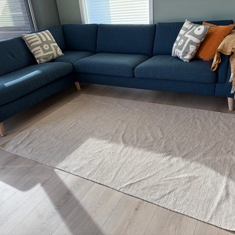 Jotex Nevada teppe i størrelse 160x220 cm. Teppe i lys beige farge med vevd, geometrisk mønster og frynser på kortsidene. Passer til bruk i stue, soverom eller andre oppholdsrom der det er behov for et mykt og strukturert gulvteppe.