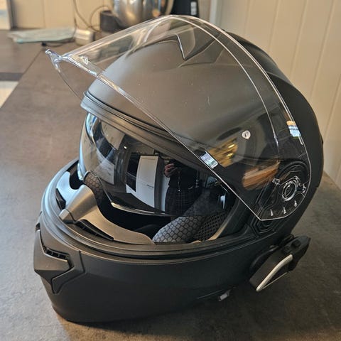 Pent brukt motorsykkelhjelm i str XL/61 med innebygde solbriller og intercom