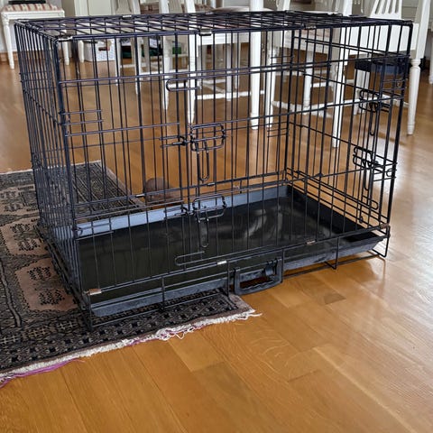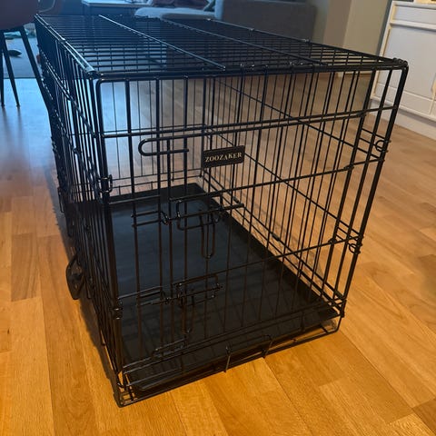 Hundebur i metall i svart farge med uttakbart bunnbrett i plast. Buret kan slås sammen for enklere oppbevaring og transport. Egnet som innebur eller transportbur til hund, avhengig av størrelse på hund og bur. Metallkonstruksjonen gir god lufting og oversikt for dyret.