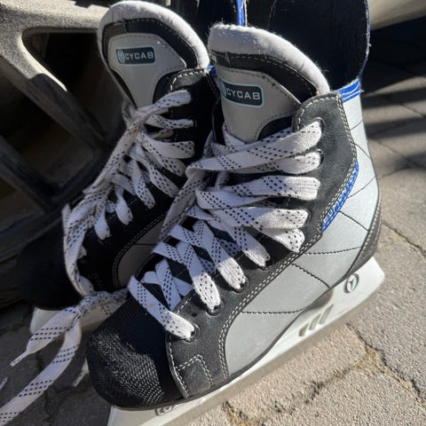 Ishockeyskøyter i størrelse 38.5 (US 6, UK 5.5, 24.3 cm lengde).