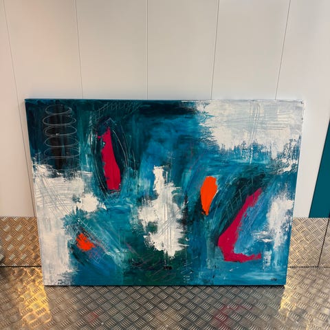 Abstrakt maleri på lerret i flerfargede toner. Bildet har et ekspressivt, nonfigurativt motiv med dynamiske strøk og kontrastfarger. Passer som veggdekor i stue, gang eller andre oppholdsrom. Leveres montert på lerretspent ramme, klar til oppheng.
