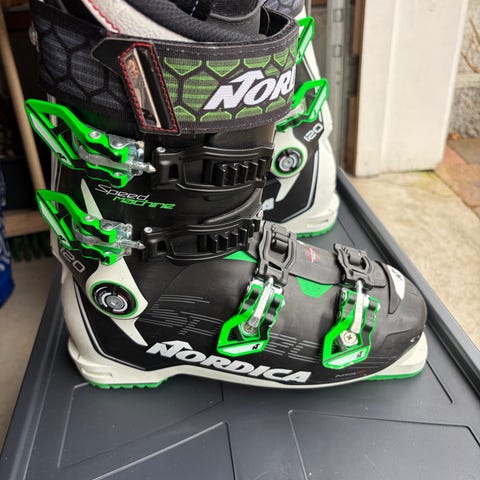 Nordica skistøvler skistøvler 43-44, synlig skade på materialet, men støvlene er fullt funksjonelle til tross for hullet.