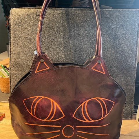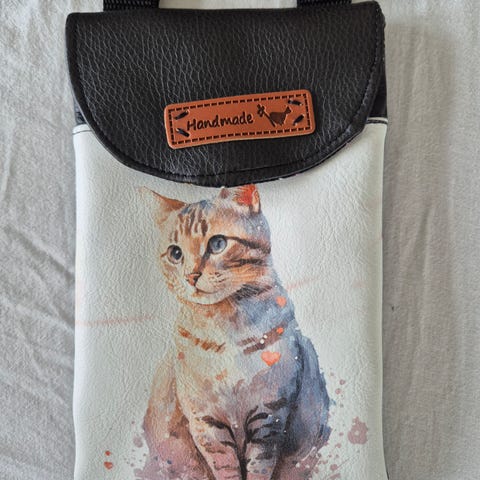 Myk, fargerik veske med kattemotiv.