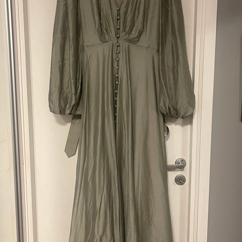 Golightly kjole til spesiell anledning for dame i størrelse L. Lang kjole i grønn farge, laget i polyester. Modellen har korte puffede ermer, høy hals og markert midje med knyting bak. Skjørtet er langt med lett utsving og splitt bak. Passer til formelle og høytidelige anledninger. Brukt 1 gang i bryllup. Nydelig på.
