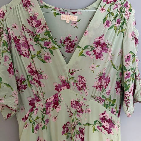 Flott grønn kjole med fint rosemønster. Glidelås i siden.