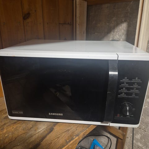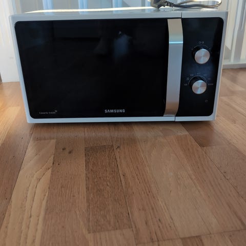 Samsung mikrobølgeovn i hvit utførelse. Modellen har keramisk innside (Ceramic Inside) og frontpanel med flere funksjonsknapper, blant annet Auto Cook, Quick Defrost, Soften/Melt, Favorite, Deodorization, Child Lock og klokkeinnstilling. Betjenes med trykknapper og dreiehjul, og har roterende glassplate inni ovnsrommet. Egnet til oppvarming, tining og enkel tilberedning av mat i hverdagen.