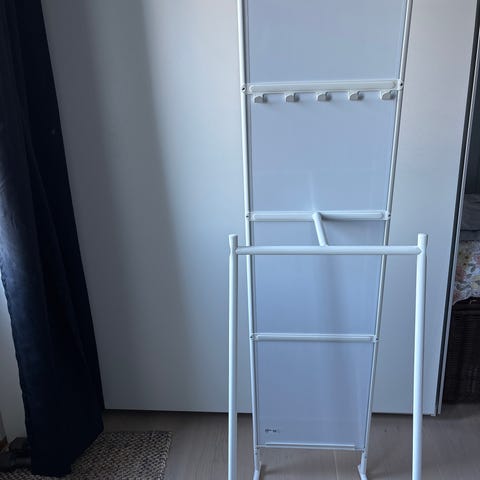 IKEA speil med integrert krokstativ i hvit farge. Speilet har en smal, rektangulær form og er montert på en ramme med flere kroker langs siden for oppheng av klær, vesker eller tilbehør. Nederst er det en holder som kan brukes til mindre gjenstander. Passer til gang, soverom eller garderobe for praktisk oppbevaring og speilfunksjon på samme sted.