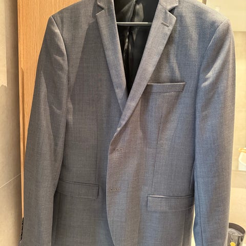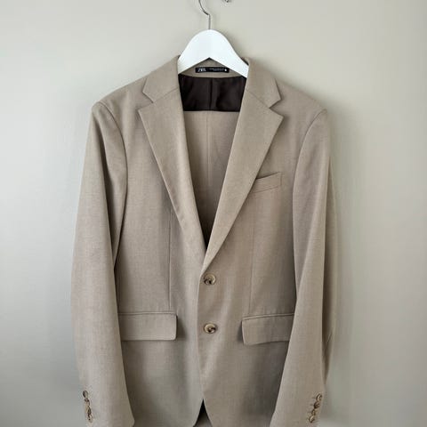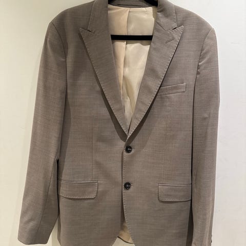Klassisk blazer. Farge lys brun med mørke knapper. Dobbel splitt bak. Slim modell. Brukt en gang.