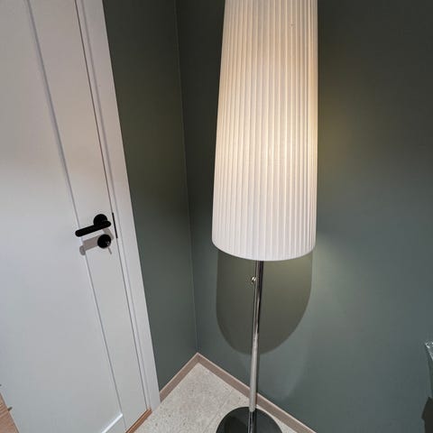 Stålampe i børstet krom. Lampeskjermen er off white. Lampeskjermen blir litt rødlig når lampen er på, litt retropreg på skjermen.