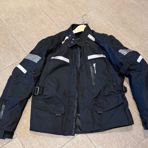 Yoko for moto jakke med avtagbart for. Lommer foran og bak, og innerlomme både i foret og i selve jakken. Beskyttelses-innlegg i rygg, på skuldre og underarm/albue. Vannavvisende. (Vanntett?) Str.M