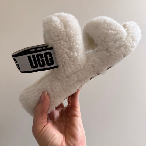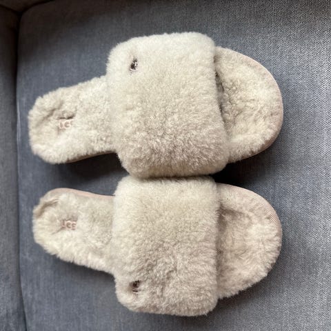 UGG tøfler i størrelse 36. Modell med åpen tå og elastisk rem med UGG-logo bak hælen. Tøflene har myk, pelsliknende overflate og såle, i en grå farge. Egnet som innetøfler for komfortabel bruk hjemme.