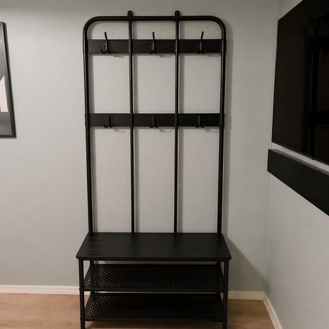 Selger et praktisk klesstativ med skohylle, sittebenk og speil. Perfekt til gangen.