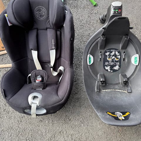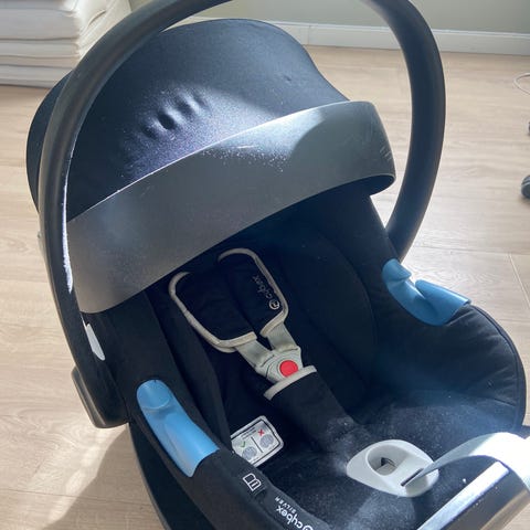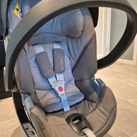 Cybex Aton 5 bilstol som har en knukket del av isoporen, se bilde. Anbefaler ikke å bruke i bil, men kan brukes i f.eks vogn. Har adaptere som passer til Emmaljunga vogn.
