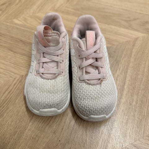 Joggesko fra Adidas i str. 22. Lyse grå med rosa og lilla detaljer. Hele og pene. Mye bruk igjen.