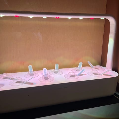 Salaten og krydderplantene sår du i små svampbitar. Røtene veks nedover i gjødsla vatn. Verkar heilt fint, men eg er så ofte og mykje vekke at det vart for vanskeleg å fylle vatn i tide og nytte vekstane. Så utstyret er lite brukt og godt som nytt, men sel det til halv pris. Kan kjøpast nytt til 2999.-