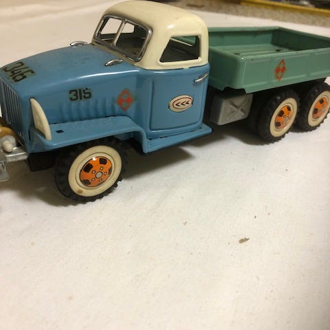 Gammel blikkbil selges kr 700,- kjøper betaler frakt med sporing via posten til kr 182,-. Norskprodusert hos Bakke finmekaniske verksted??. Hvis disse bilene hadde opptrekksmotor så mangler den på denne blikkbilen. Plata på undersiden er noe løs, har blitt skrudd på. Reservehjulet mangler. Setet borte?. Noe bruksspor og aldersslitasje men i ok stand. Lengde ca 30cm. Sender/selger ikke via fiksferdig, sender heller ikke med postnord. Blikkbilen sendes via posten mot forskuddsbetaling til konto.