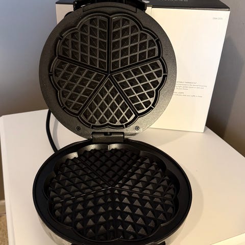 vaffeljern for steking av runde vafler inndelt i hjerter. Jernet har slippbelegg på platene og lokk med håndtak. Egner seg til vanlig bruk på kjøkkenet for tilberedning av vafler til frokost, dessert eller kaffestund.
